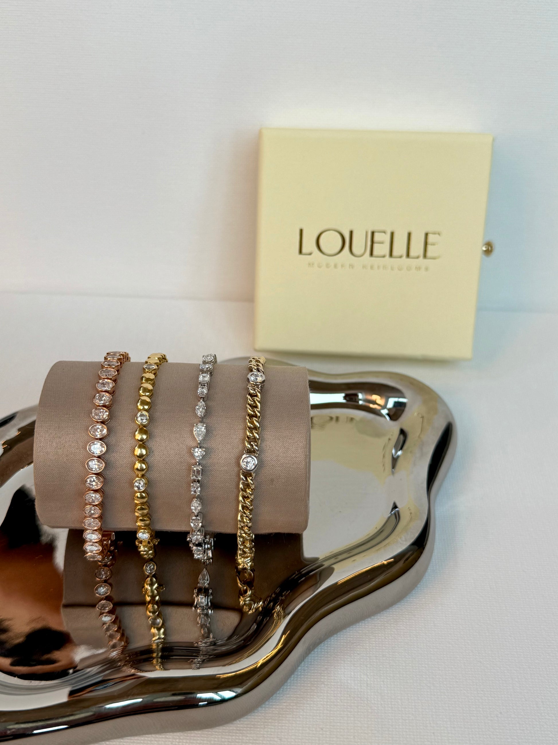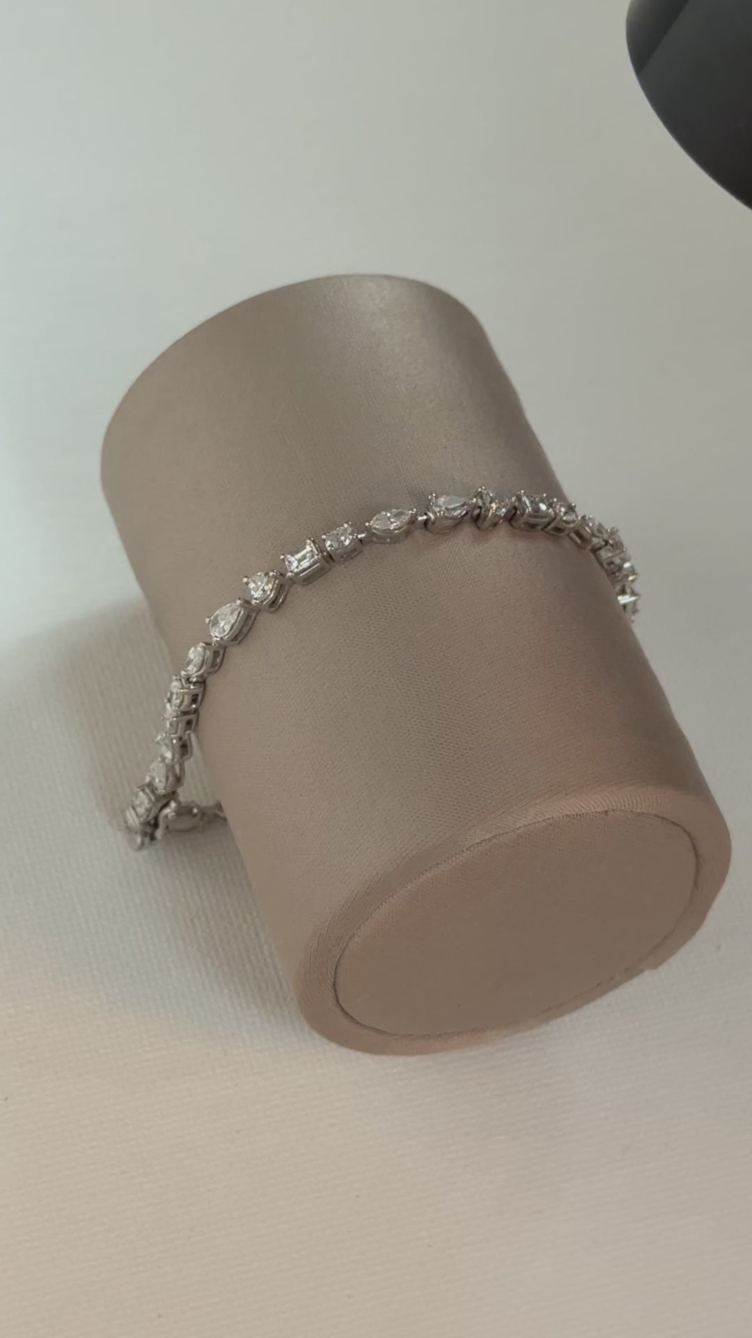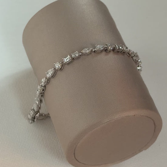 The Isabelle Bracelet features a striking mix of heart, oval, emerald-cut, pear, and round brilliant natural diamonds, handset in solid 18-karat gold. Designed to make a statement, this piece blends playful shapes with refined elegance for an unexpected take on the classic tennis bracelet.